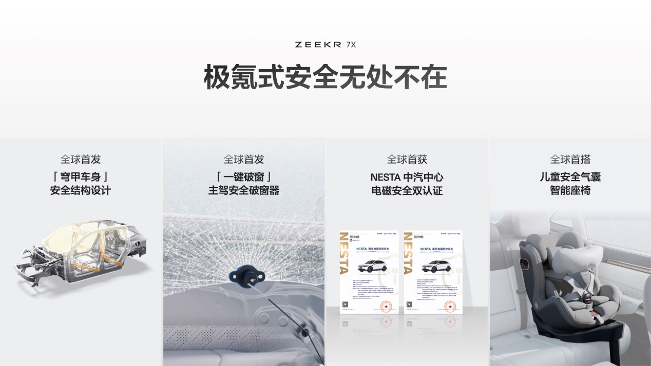 安全是检验豪华的第一标准。发布会上,极氪智能科技副总裁朱凌强调,极氪式安全从不满足于应试工况,而是在实战中造就“公路坦氪”。基于吉利强大的汽车安全数据库,极氪从5万多起真实事故案例中,总结风险最大,难度最高的工况,做定制化的安全开发,为极氪7X带来4项全球首发安全功能。