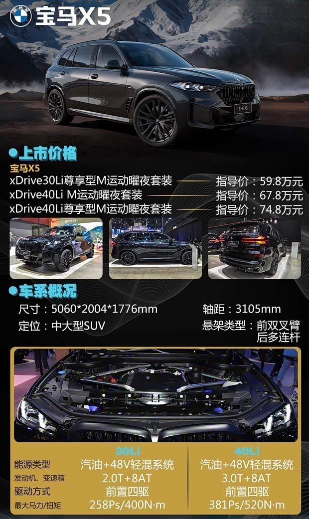 全新宝马X5于广州车展正式发布,官方指导价区间为59.8万至74.8万元。作为首款提出SAV概念的车型,宝马X5历经四代更迭,始终保持着卓越的公路性能与操控体验。