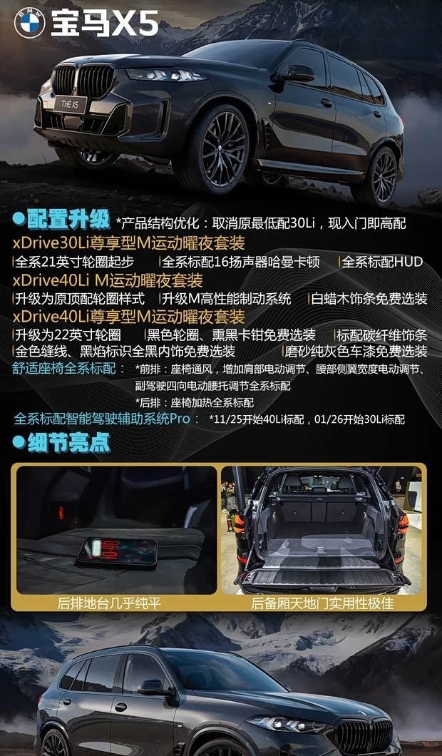 配置方面实现全面升级。全系标配21英寸轮毂、16扬声器哈曼卡顿音响系统及HUD抬头显示功能。座椅配置方面,舒适型座椅成为标配,并提供丰富的调节功能。智能驾驶辅助系统Pro将在不同时间节点实现标配:30Li版本自明年1月26日起,40Li版本则从今年11月25日开始。