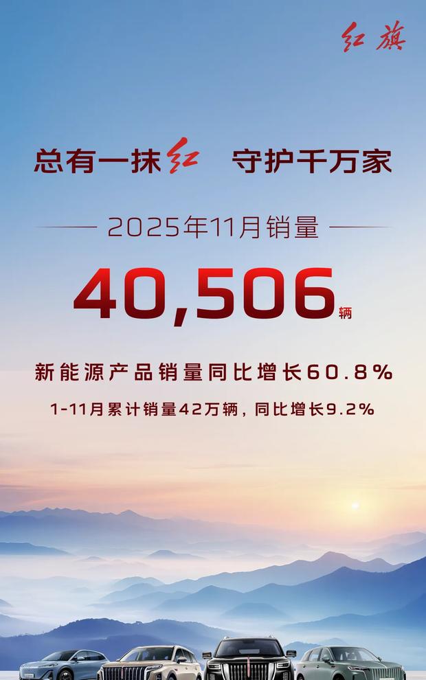 红旗品牌近日公布11月销售业绩,单月销量超过4万台,其中新能源车销量同比大幅提升60.8%,持续成为推动整体增长的重要力量。与此同时,定位高端的金葵花系列产品月销量再度超过百台,在百万级豪华车市场中迈出坚实一步。今年1至11月,红旗累计销量已突破42万辆,较去年同期增长9.2%。