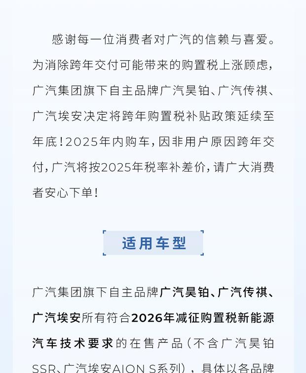 此次补贴覆盖广汽昊铂、广汽传祺及广汽埃安品牌中符合2026年新能源车购置税减征技术要求的在售车型。不过,昊铂SSR与埃安AION S系列未列入本次补贴范围,具体车型目录需以各品牌官方发布为准。