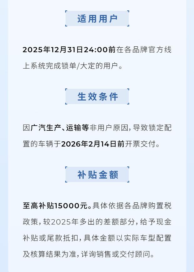 广汽集团近日宣布,为旗下自主品牌部分新能源车型推出跨年购置税补贴方案。根据政策,若因生产或物流等厂商原因导致车辆无法在2026年2月14日前完成开票交付,符合条件的用户可获得最高15000元的现金补贴或尾款抵扣。