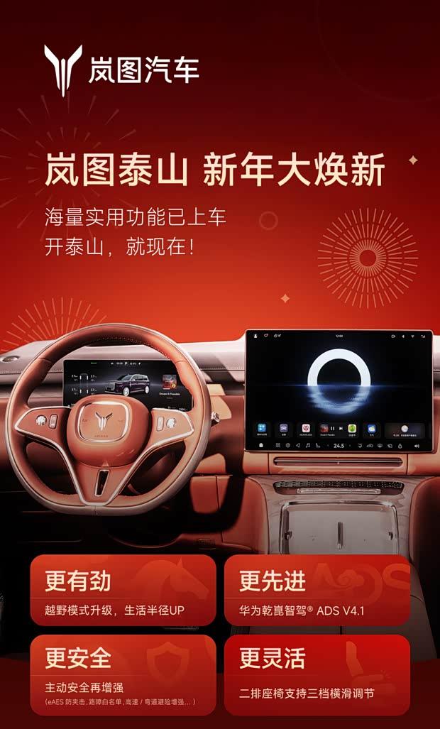 岚图汽车旗下大型SUV泰山于2月6日启动首次OTA升级,此次升级聚焦智能座舱、辅助驾驶与越野性能三大板块,核心为华为乾崑智驾ADS 4.1系统。据了解,该车型目前共推出3款配置,官方指导价区间为37.99万元至50.99万元。