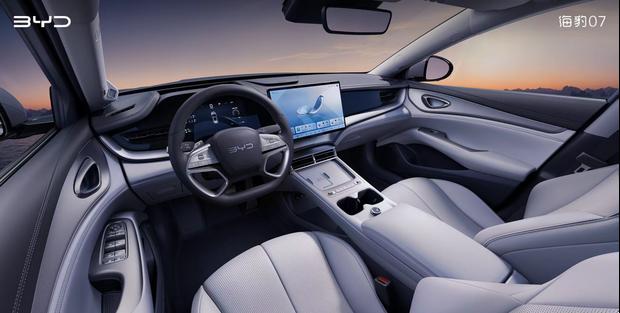 进入车内,海豹07 EV沿用海洋美学理念,中控台为环绕式布局,配备“2+1”式联动屏幕与W-HUD抬头显示系统。换挡机构采用怀挡设计,使中央通道区域更显简洁,该区域布置有车载冷暖冰箱及无线快充等功能。座椅运用波浪缝线工艺,预计将提供通风、加热及按摩等多种舒适配置。据悉,新车有望搭载最新的智能驾驶系统,全系支持城市导航辅助驾驶功能。