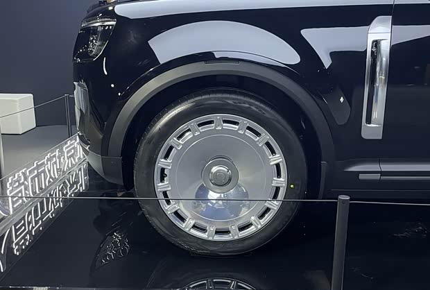 车辆配备枪灰色双七辐轮圈,内置红色制动卡钳,并搭载305宽胎及前六活塞、后四活塞高性能刹车系统。车顶行李架与侧踏板等配置,则增强了实用性与越野属性。车尾设计同样注重硬派风格与细节呼应,顶部内嵌五组间断式高位刹车灯,延续了整车“五元素”设计概念。后备厢采用对开式尾门,兼顾实用性与仪式感。