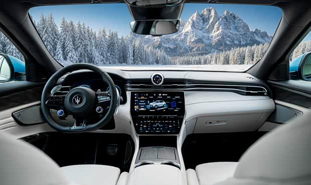 进入车内,内饰选用Ghiaccio真皮包裹,并搭配了专属饰板与细节装饰。特别版车型还配备了定制脚垫,并在迎宾灯光系统中集成了三叉戟徽标投影功能,在打开车门时可将品牌标识投射于地面。