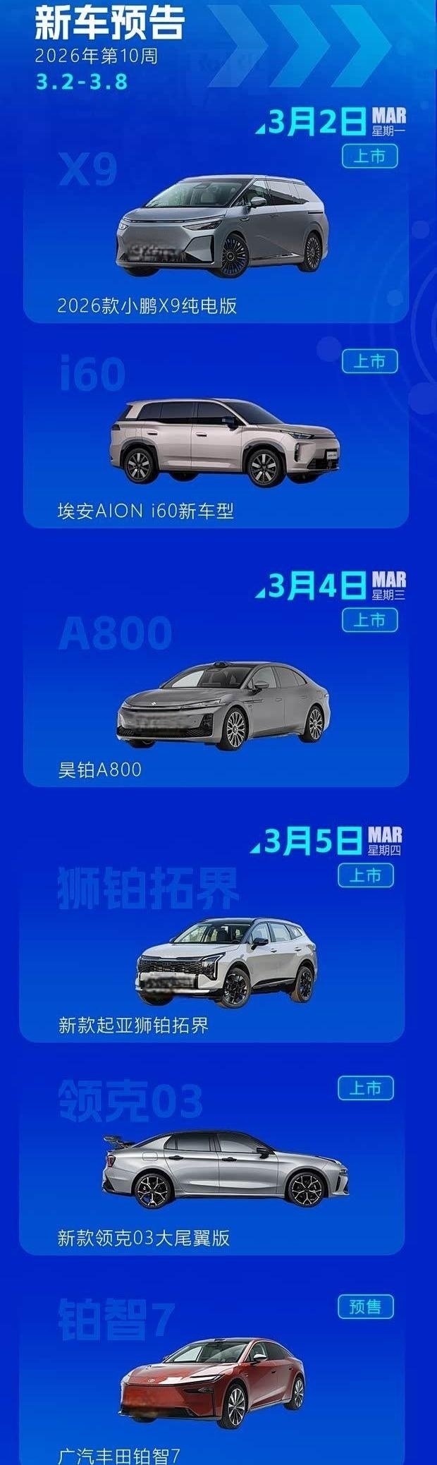 本周将有多款新车型陆续上市、首发或开启预售,涵盖纯电与增程等多种动力形式。其中,2026款小鹏X9纯电版、昊铂A800、广汽丰田铂智7等车型备受关注。