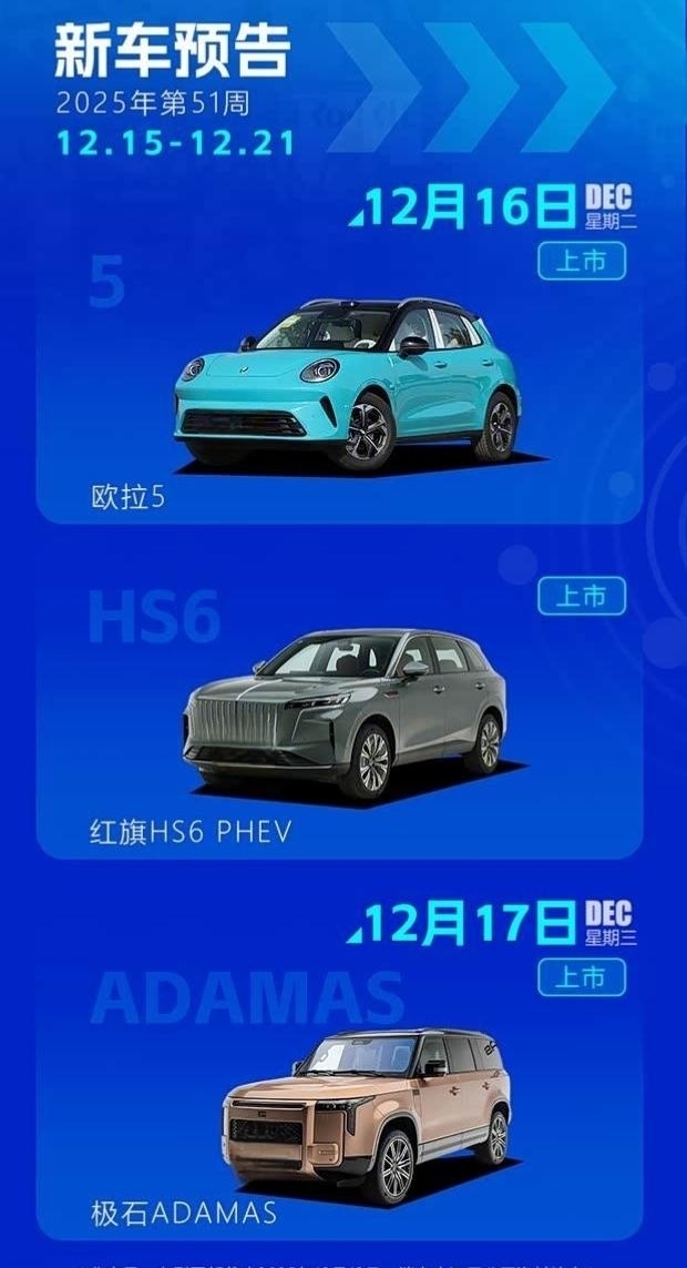 本周国内汽车市场将迎来多款新车型的集中亮相。从12月15日至21日,预计将有包括欧拉5、红旗HS6 PHEV以及极石ADAMAS在内的多款车型正式上市,为消费者提供更丰富的购车选择。
