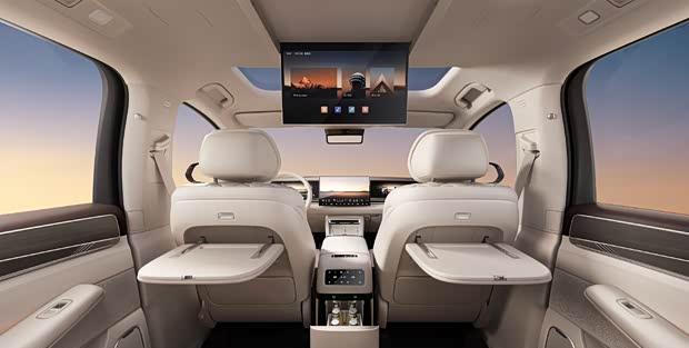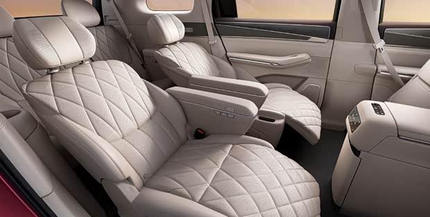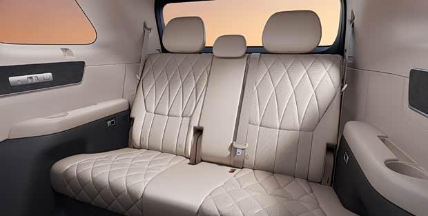 第二排配备独立座椅,带有一体式腿托,菱形缝线工艺增强了豪华感,并支持一键放平功能。此外,二排还提供大尺寸折叠屏、小桌板及车载冰箱。第三排座椅同样支持电动调节,并具备加热功能。