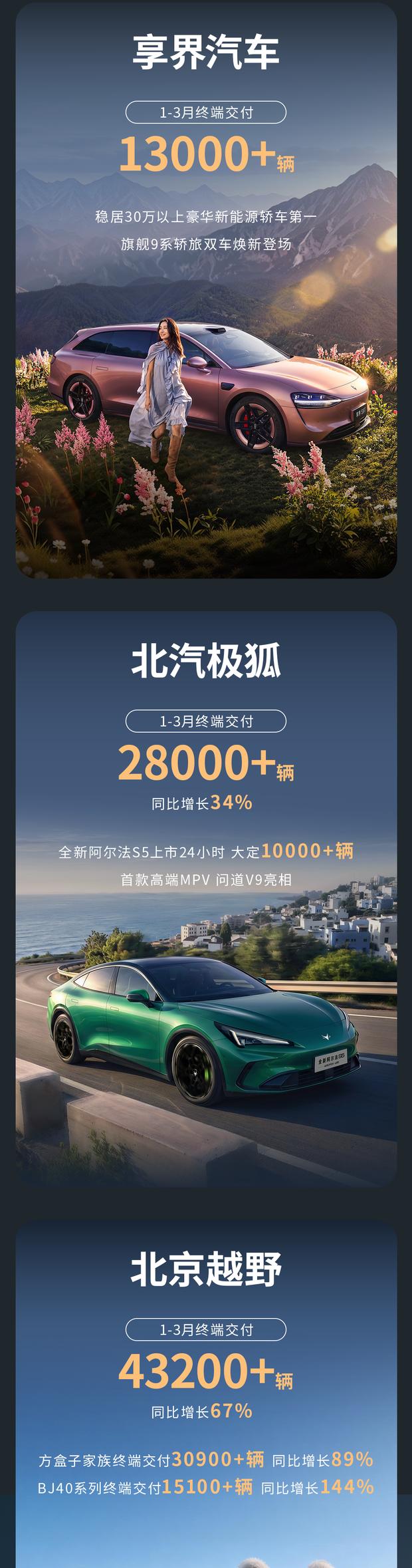从旗下重点品牌一季度交付情况看:享界汽车前三个月终端交付量突破1.3万辆;北汽极狐交付超过2.8万辆,同比增长34%;北京越野交付量逾4.32万辆,同比大幅增长67%。多品牌共同发力,支撑集团向高质量方向发展。