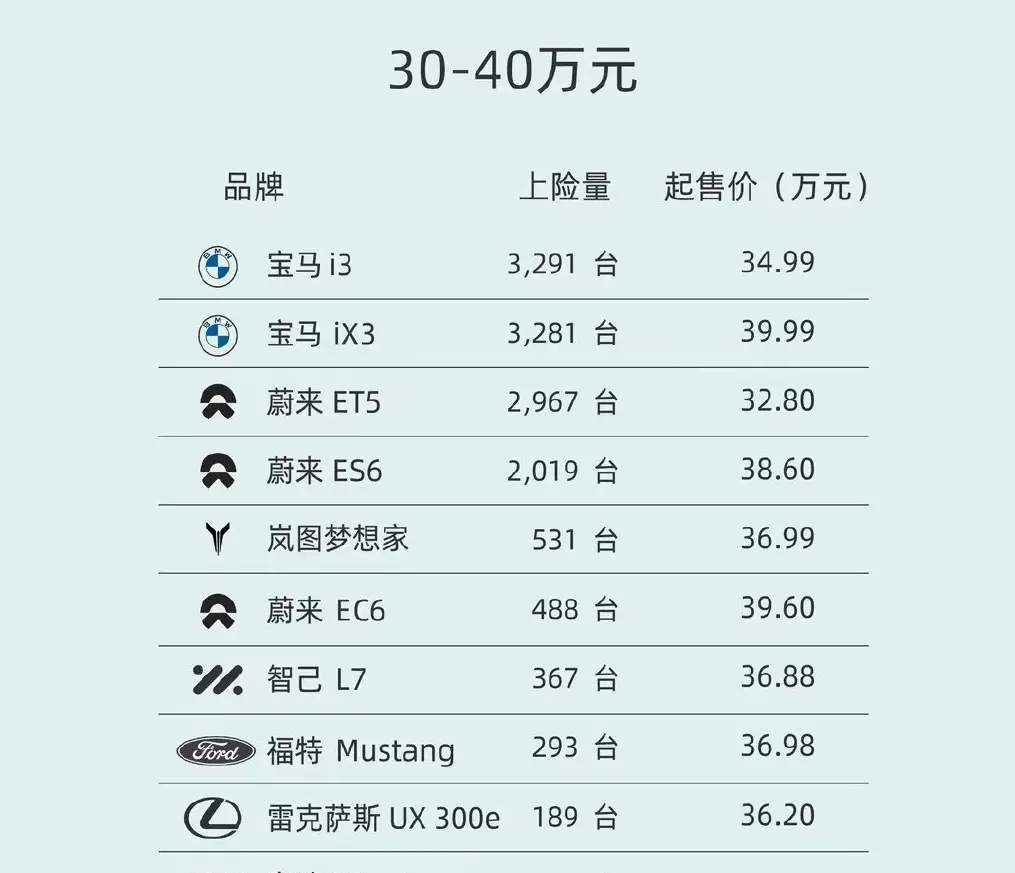 极氪是真正30万到40万销量最好的,均价34万以上,宝马i3和ix3都打骨折了,才勉强有那点销量。