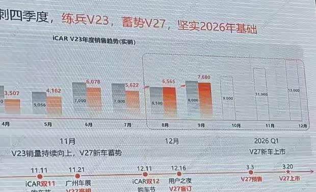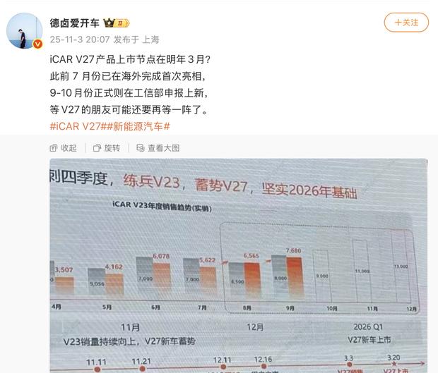 iCAR品牌首款增程式SUV车型V27计划于2026年第一季度正式推向市场。据相关消息透露,该车系或将于3月3日开启预售,并于3月20日完成上市。作为品牌V系列旗舰车型,新车定位中大型SUV,预计售价区间为20-30万元。