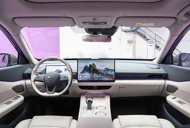 内饰采用环抱式座舱布局,提供晨曦岚白与穹宇黑灰两种配色方案。全新设计的多功能方向盘配备四向滚轮操控系统。中控台搭载10.25英寸全液晶仪表与15.6英寸智慧中控屏,集成华为鸿蒙智能座舱系统,支持AI语音助手、手机车机互联功能,并配备无麦K歌、笑脸抓拍等情景应用,保留实体物理按键。