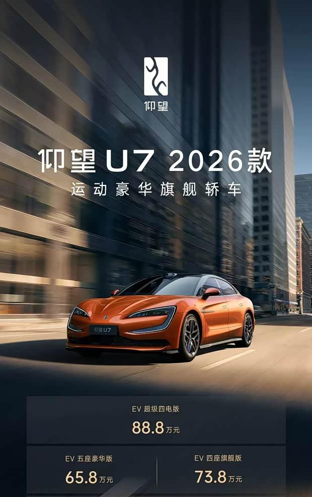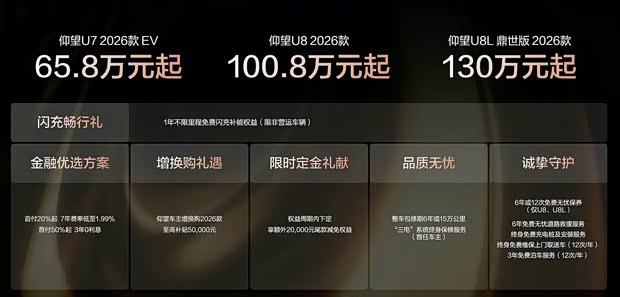 3月5日,2026款仰望U7正式推向市场,此次共发布5款配置,价格区间为65.8万元至88.8万元。该车型首次应用第二代刀片电池,CLTC工况下纯电续航最高可达1006公里。