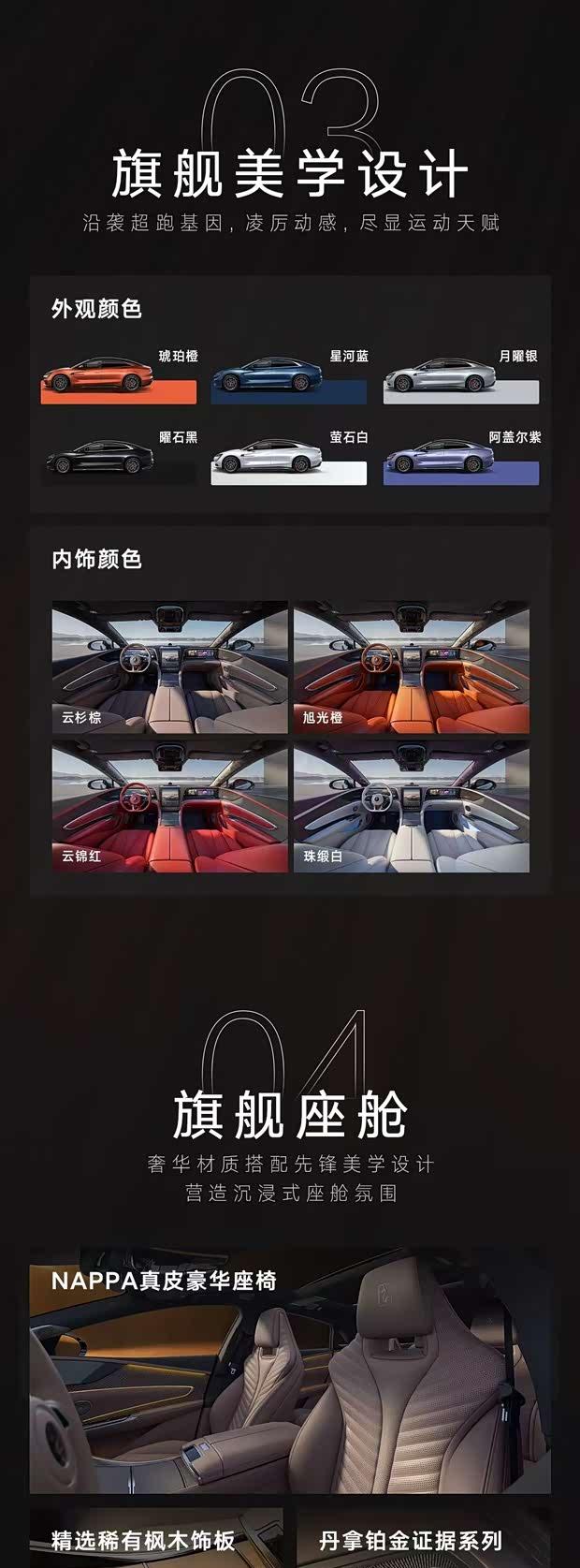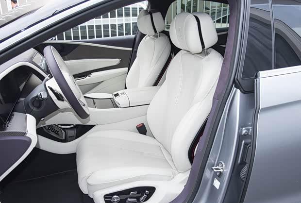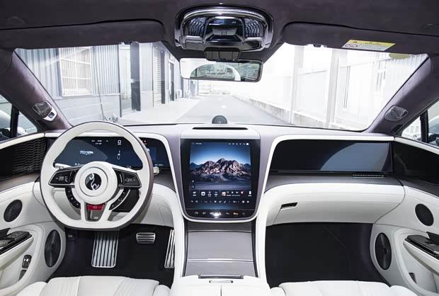 内饰部分注重豪华与科技感的营造。中控采用对称式布局,中央为大尺寸竖状触控屏,两侧嵌有液晶仪表与副驾娱乐屏。座椅提供4座与5座选择,表面覆盖Nappa真皮,前排座椅支持多达20向调节,具备腰部支撑、通风加热及热石按摩等功能。4座版本的后排为独立座椅,中央扶手集成娱乐控制屏,并配备一键舒享模式,可实现大幅后仰,同时带有电动腿托、头枕与脚托。音响系统方面,新车搭载了拥有23个扬声器的丹拿品牌音响。