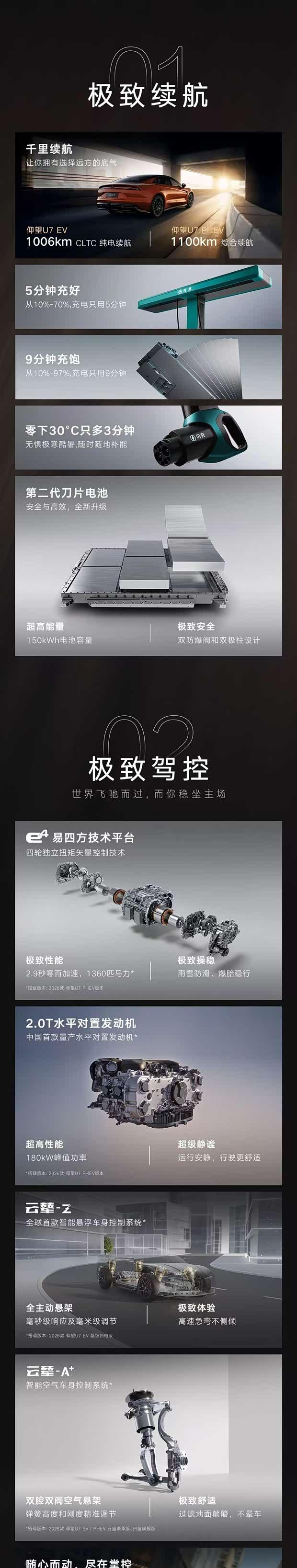 动力性能是新车的一大亮点。纯电版本搭载四电机,提供860公里与1006公里两种续航版本。插电混动版本则由2.0T水平对置发动机与四电机组成,前电机最大功率提升至260千瓦,系统总功率达到1000千瓦,其纯电续航分别为200公里与220公里,综合续航里程可达1100公里。依托第二代刀片电池与闪充技术,车辆充电速度显著提升,电量从0%至70%仅需5分钟,从10%充至97%也只需9分钟。