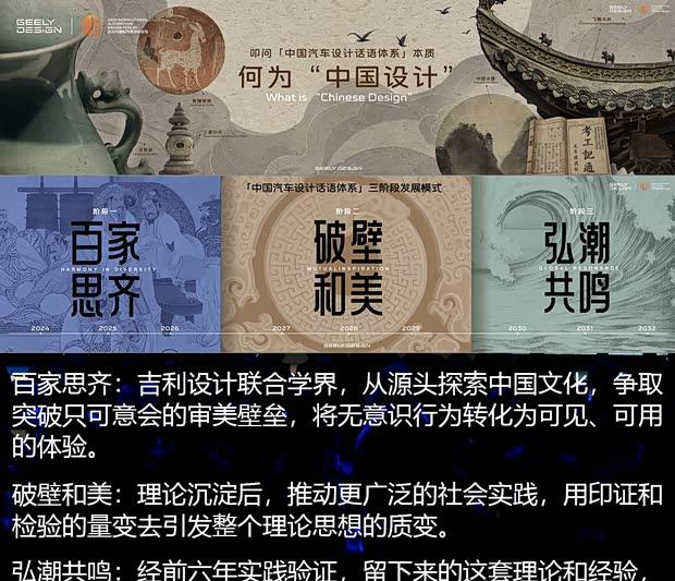 2024年12月,第二届论坛如期举办。吉利创新设计院宣布启动“十年三阶段”计划,首阶段名为“百家思齐”,旨在联合行业力量,共同构建中国汽车设计话语体系。该年度已在设计实践中积累初步成果:瓷器般的“润”感造型、针对汽车曲面的“中国R角”研究、融入东方符号的纹样设计,以及专注于乘坐舒适的“舒服车”概念,逐步形成吉利银河的独特气质。