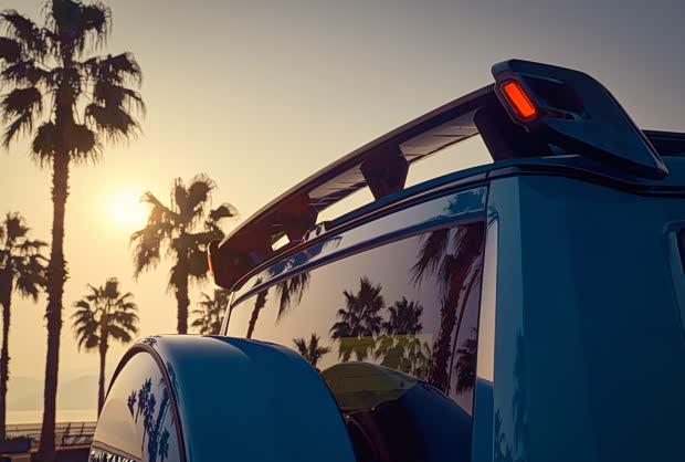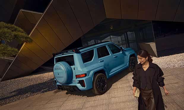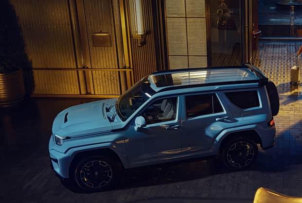 车身尺寸方面,新车的长宽高分别为5105毫米、2061毫米及1985毫米,轴距达到3000毫米。车尾部分同样强调运动风格,后包围融入导流槽设计,车顶配备造型醒目的后扰流板。尾门延续了侧向开启方式,兼顾实用性与硬派风格。