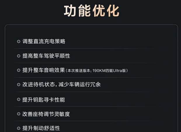 在功能优化上,本次升级调整了直流充电策略,进一步提高了整车行驶的平顺性与音响系统的表现效果。此外,系统还改进了车辆待机状态,增强了智能钥匙的寻卡性能,并提升了座椅调节的灵敏度与制动舒适性。