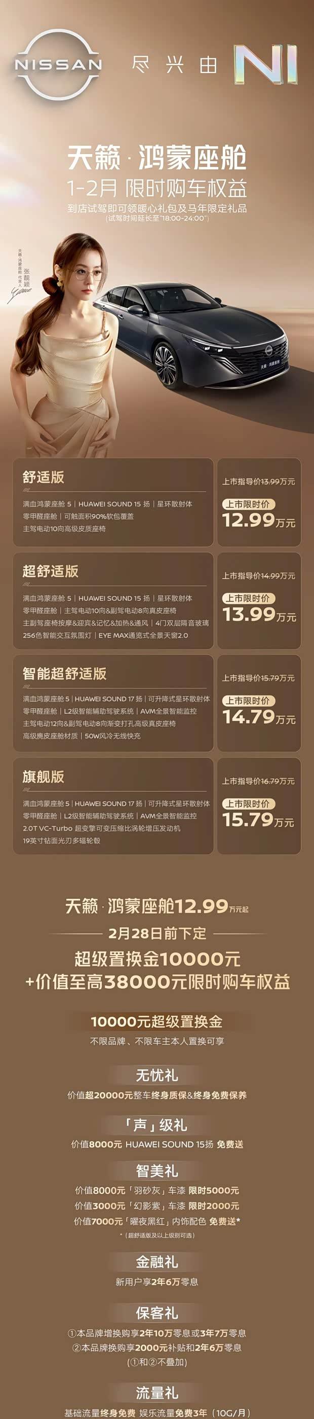 东风日产近日宣布,针对天籁·鸿蒙座舱车型推出限时购车政策,并对部分版本售价进行调整。活动期间为2026年1月至2月,舒适版限时售价为12.99万元起,同时品牌还延长了每日的到店试驾服务时段。