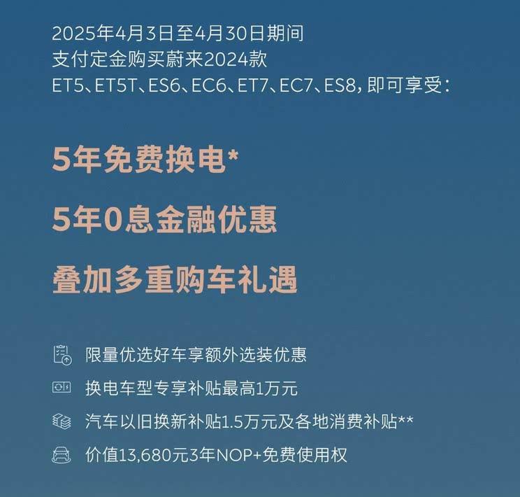 据了解,蔚来针对2024款多款车型推出了限时购车优惠,包括5年免费换电服务、金融免息政策等多项权益。这些促销措施可与现有购车政策叠加使用,为消费者提供了更具吸引力的购车方案。