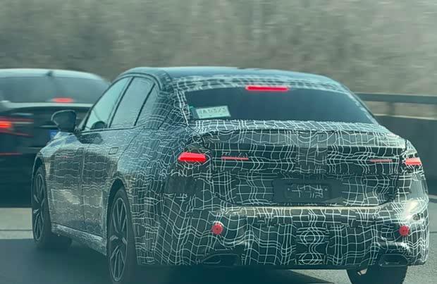 车身侧面,新车的前后翼子板带有轻微的宽体效果,车门把手采用了隐藏式设计。测试车辆装备了一套双五辐造型的轮圈,尺寸预计为18英寸,并且可以看到其配备了前四活塞制动卡钳。车尾部分,尾灯组的设计显得更为修长,后包围则采用了双边共两出的排气布局。据悉,国产后的车型仍将提供长轴距版本以满足市场需求。