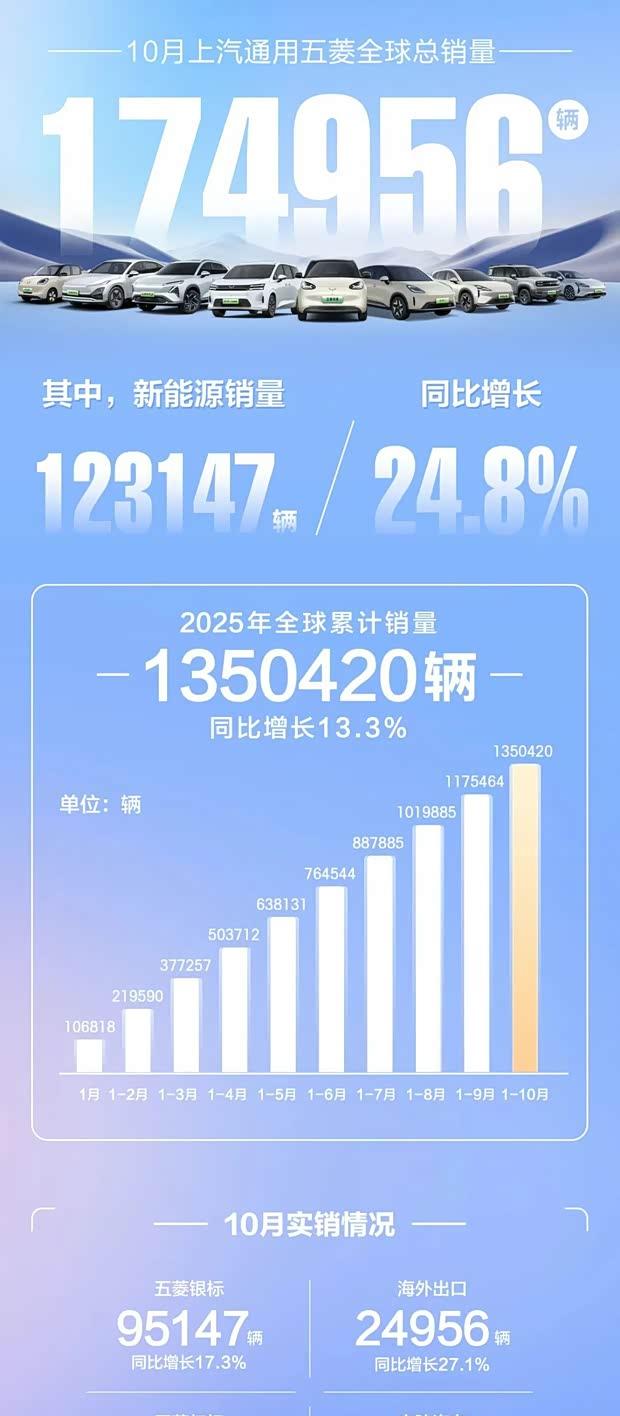 上汽通用五菱于11月4日发布最新销售数据,显示其10月份全球总销量达到174956辆。其中新能源车型表现突出,单月销量为123147辆,较去年同期增长24.8%。