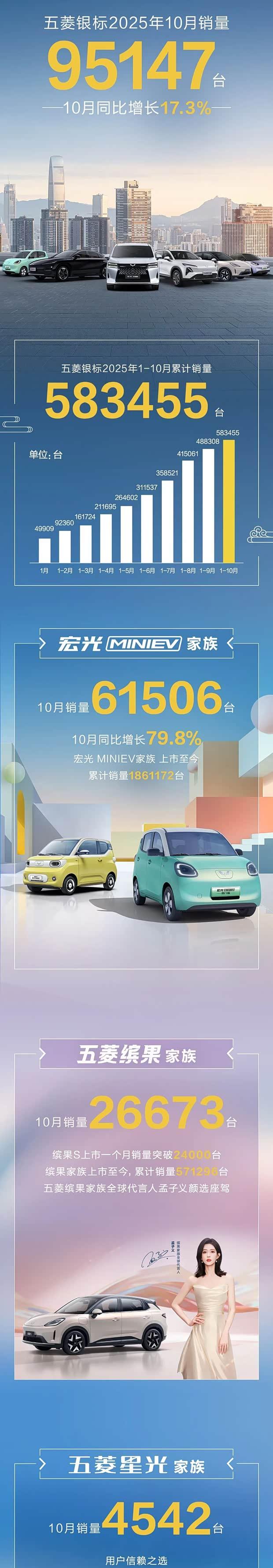 在具体车型方面,宏光MINIEV家族10月单月销量达61506台,同比增长79.8%。该车型自上市以来累计销量已突破180万台,达到1861172台,成为中国品牌纯电车型中销量最高的单一车型。五菱缤果家族10月销量为26673台,累计销量达571296台;五菱星光家族10月销量为4542台,累计销量为150507台。