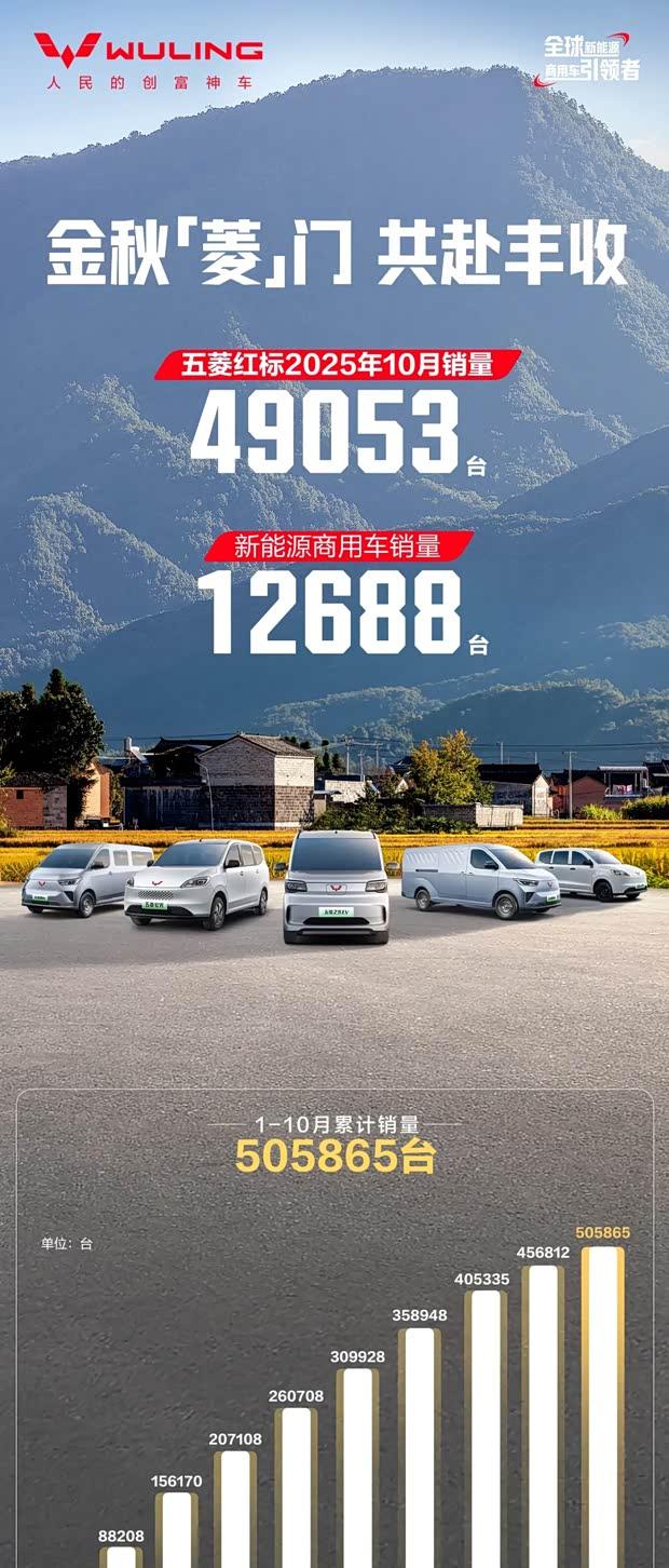 五菱品牌旗下银标系列10月销量达95147台,同比增长17.3%;红标系列当月销量为49053台。从累计数据来看,今年1-10月银标系列总销量为583455台,红标系列累计销量达505865台。