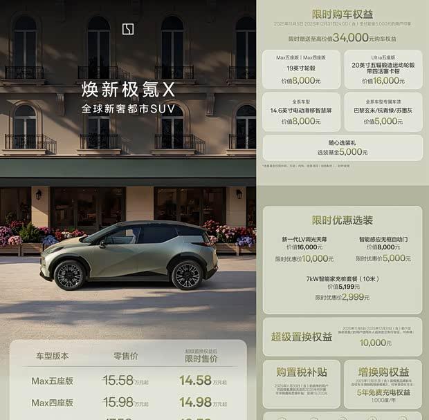购车政策方面,官方推出限时权益:即日起至12月31日24时,支付5000元定金的用户可获得价值34000元的购车礼遇,其中包含5000元选装基金等多项权益。