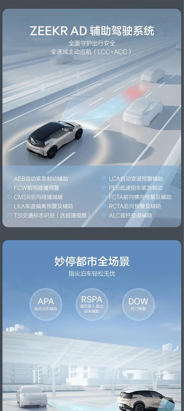 智能驾驶方面,新车搭载ZEEKR AD辅助驾驶系统,支持全速域主动巡航等多项功能。