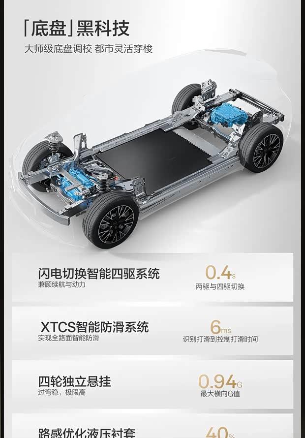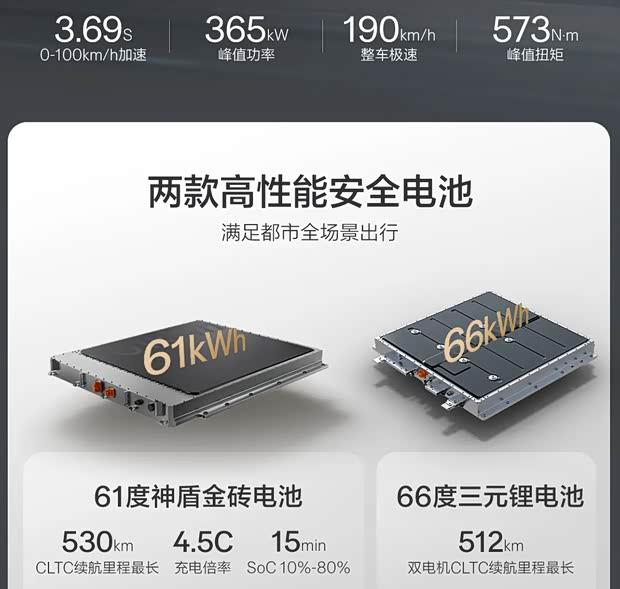 动力系统搭载高性能电机,峰值功率达365千瓦,扭矩573牛·米,百公里加速仅需3.69秒。电池提供61千瓦时神盾金砖电池与66千瓦时三元锂电池两种选择,CLTC续航分别为530公里和512公里。同时配备智能四驱系统、XTCS防滑系统及Akebono四活塞卡钳。
