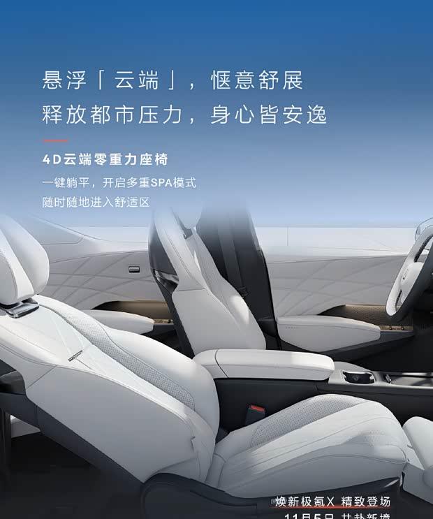 内饰部分,新款极氪X提供灰白与黑橘两种双色风格选择,中控区域配备可电动滑移的大屏。此外,车辆搭载智能控温中岛冰箱、感应无框自动门、4D云端零重力座椅、后排坐垫电动翻折功能以及新一代LV调光天幕等配置,进一步提升了驾乘舒适性。