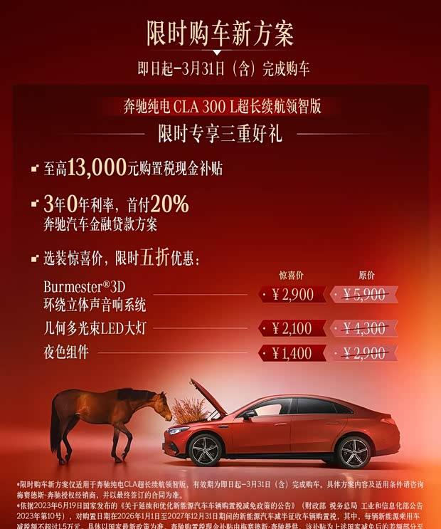 除了软件升级,奔驰还为纯电CLA推出了限时购车方案。针对300 L超长续航领智版车型,消费者可享受最高13000元的购置税补贴。此外,购车还可选择首付20%、3年0利率的金融方案,部分选装配置在此期间也提供限时五折优惠。