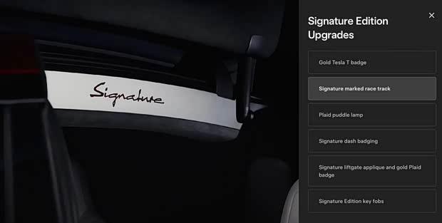 内饰采用白色Alcantara材质覆盖,车内多处设有签名版专属标识,仪表台还装有带编号的专属铭牌。该版本同时配备Plaid迎宾灯与定制钥匙扣。此外,签名版标配豪华套装,包含终身免费使用超级充电桩以及完全自动驾驶系统。