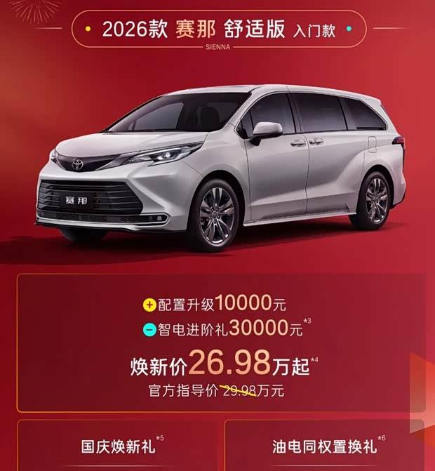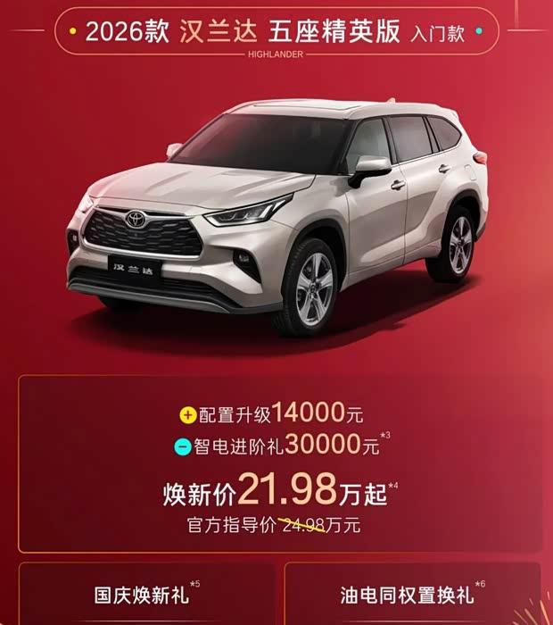 此次活动中,购买铂智3X车型可获得1万积分回馈。2026款赛那SIENNA起售价调整为26.98万元,其中包含3万元智电进阶礼遇,同时提供最高3000元国庆焕新礼及1.8万元置换补贴。汉兰达2026款起售价为21.98万元,同样享受3万元智电进阶礼,配合最高3000元焕新礼和1.5万元置换权益。