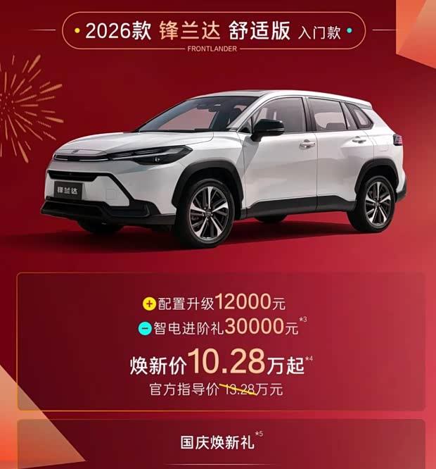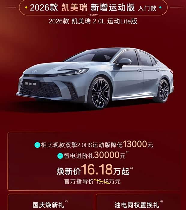 2026款凯美瑞新增运动版车型,起售价格16.18万元,包含3万元智电进阶礼,还可获得最高3000元焕新礼及8000元置换补贴。锋兰达舒适版起售价10.28万元,享有3万元智电进阶礼与最高3000元焕新礼遇。