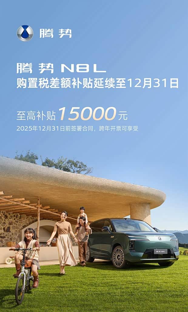 与此同时,腾势N8L车型的购置税差额补贴政策将延续实施。在12月31日前签署购车合同的用户,若因生产或交付安排导致实际开票时间延至2026年,可享受相应的购置税补贴,最高补贴金额达1.5万元。