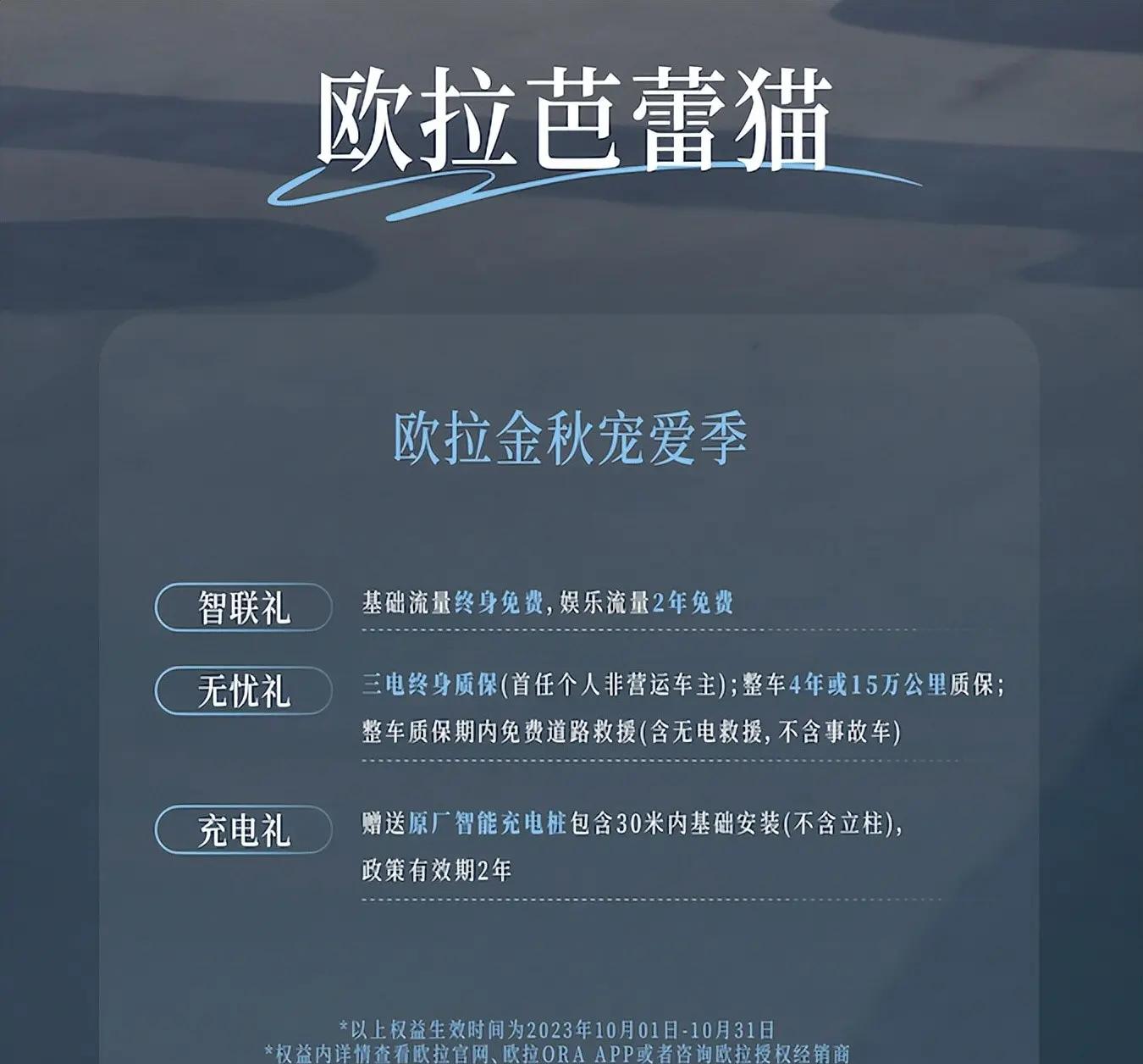 而购买欧拉芭蕾猫并没有现金优惠,仅提供基础流量终身免费、娱乐流量2年免费、三电终身质保、整车4年或15万公里质保以及赠送原厂充电桩等权益。欧拉芭蕾猫的官方指导价区间为14.98万至17.98万元。
