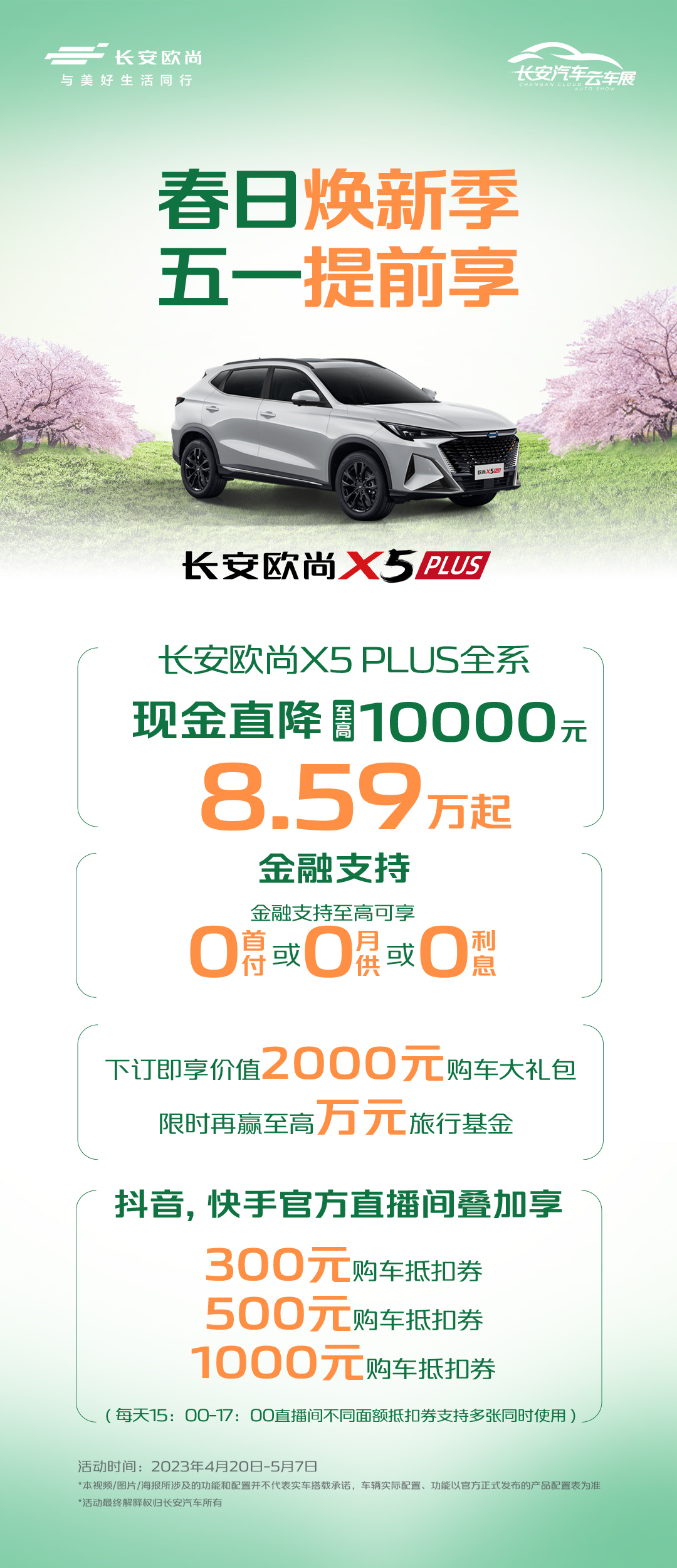 欧尚X5 PLUS全系现金直降至高10000元,售价8.59万元起。进入欧尚汽车官方直播间还可加享“300元购车抵扣券”、“500元购车抵扣券”、“1000元购车抵扣券”,不同面额抵扣券支持多张同时使用!运动、时尚、品质的全新体验,欧尚X5 PLUS的产品超赞,福利更超赞!