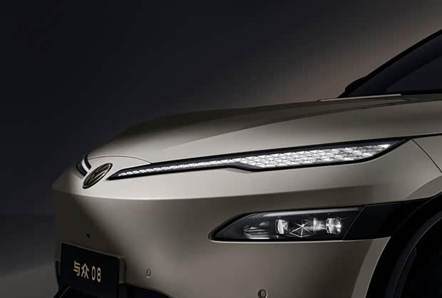 从外观来看,与众08采用了全新的设计语言。前脸部分,狭长上扬的日间行车灯与中央品牌标识相呼应,营造出独特的视觉风格。封闭式格栅配合下方梯形进气口及略带铲形的前唇设计,进一步增强了整车的运动气息。