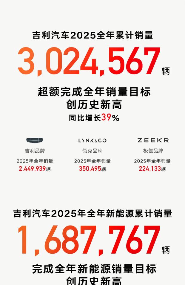 吉利汽车集团日前发布2025年度销售业绩报告,多项指标刷新纪录。数据显示,该集团全年累计销售汽车超过302万台,不仅突破300万台的年度目标,也创造了品牌历史新高。至此,吉利汽车全球累计总销量已跨越2000万台大关。