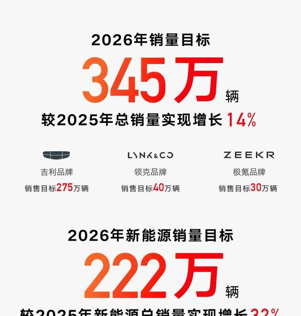 面向未来,吉利汽车计划在2026年内推出约10款全新车型,并将全年销量目标设定为345万台,其中新能源车型销量目标为222万台。