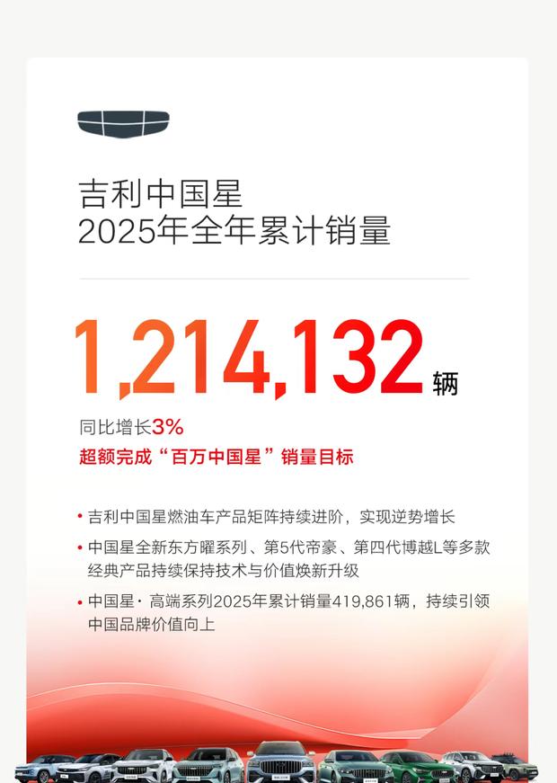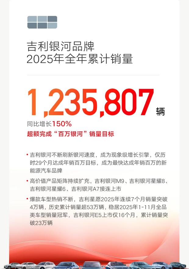 分品牌来看,吉利银河系列2025年累计交付近124万台,同比大幅增长150%。其中,银河E5车型上市16个月累计销量突破23万台;星愿车型则连续7个月单月销量超过4万台,全年累计销售超过53万台。定位高端的“中国星”系列年销量约为42万台。