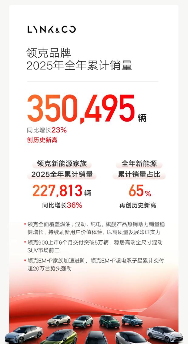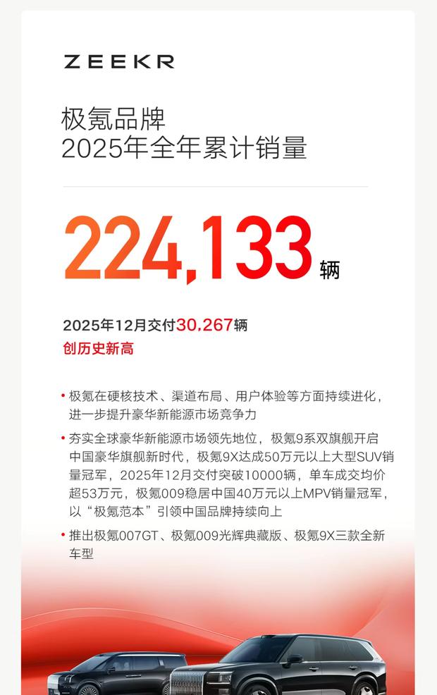 领克品牌全年销量突破35万台,同比增长23%。其新能源车型销量占比达到65%,全年累计销售近22.8万台,同比增长36%。极氪品牌在12月单月交付量超过3万台,全年累计交付约22.4万台。旗下极氪9X车型在50万元以上大型SUV细分市场占据销量榜首,12月交付量突破1万台,平均成交价格超过53万元。