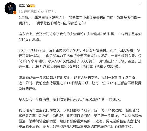 雷军在介绍中强调:“新款SU7的升级将涵盖新颜色、新轮圈、新内饰,同时安全性进一步强化,全系标配激光雷达,辅助驾驶功能实现全面满配,续航里程也将迎来重要突破。”他还补充道:“更先进的智能底盘技术将提升驾驶质感,更强大的智能座舱与辅助驾驶系统共同打造出众的智能用车体验。”