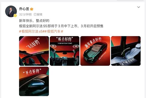 北汽新能源旗下极狐品牌近日宣布,其新款阿尔法S5中型轿车计划于3月初启动预售,并于3月中下旬正式上市。品牌用户运营中心副总经理乔心昱通过社交平台透露了相关规划。据悉,该车型已完成工信部申报,除保留纯电版本外,还将首次推出增程动力版本。