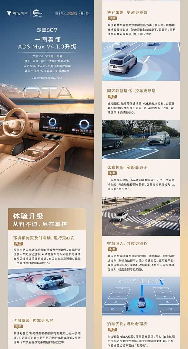深蓝汽车近日宣布,旗下大型SUV深蓝S09启动新一轮OTA升级,版本更新为ADS Max V4.1.0。此次升级聚焦于智能辅助驾驶系统的多项功能优化,旨在进一步提升车辆的行车安全与驾驶体验。据了解,深蓝S09目前共提供6款配置,官方指导价格介于23.99万元至30.99万元之间。