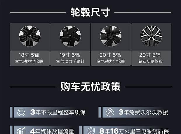 在动力性能上,单电机后驱版本最大功率为200千瓦,0-100公里/小时加速时间分别为5.7秒与5.3秒,电量从10%充至80%所需时间约为26至28分钟,对应的CLTC续航里程分别为410公里和590公里。双电机四驱版本综合功率达到315千瓦,0-100公里/小时加速仅需3.6秒,10%-80%充电时间为28分钟,CLTC续航里程为540公里。