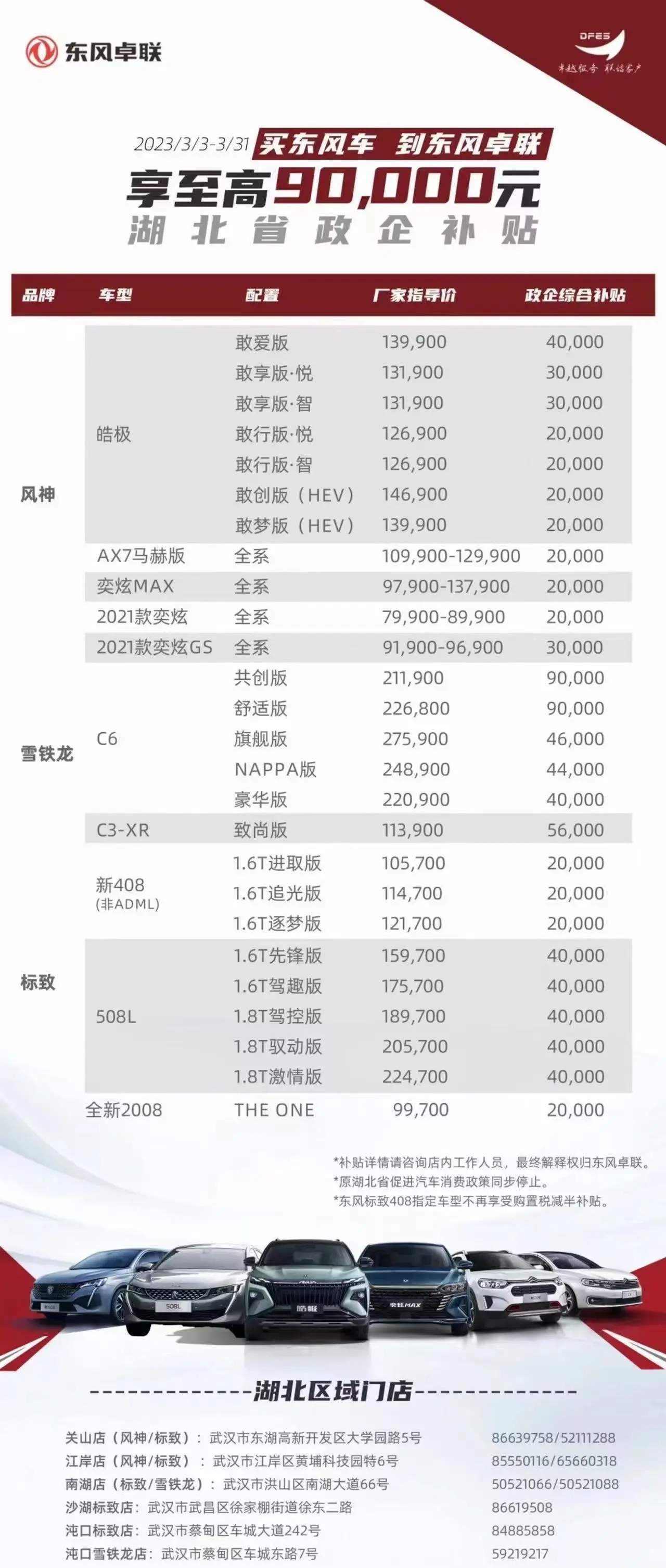 作为另一个法系车代表,东风标致全系车型也有2万至4万元不等的降幅。东风标致海报显示,3月3日至3月31日在湖北省内含补贴至高优惠达4.8万元。
